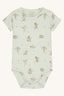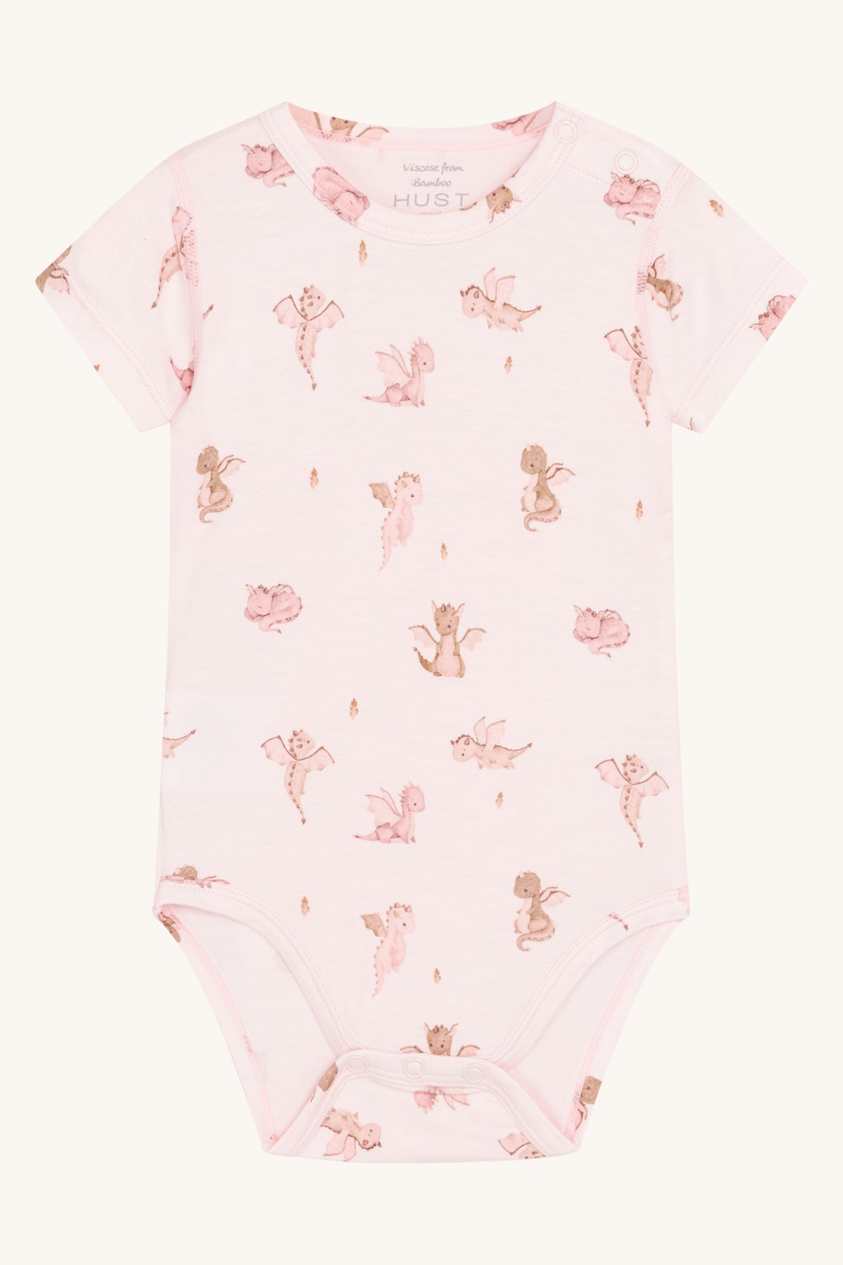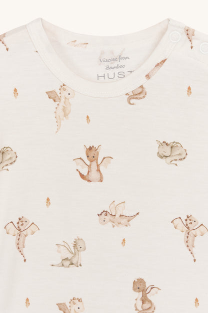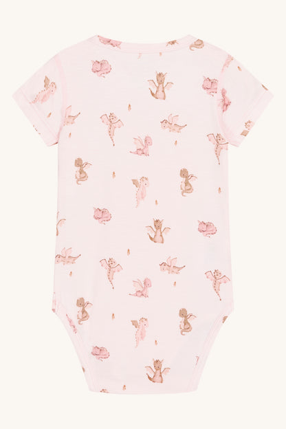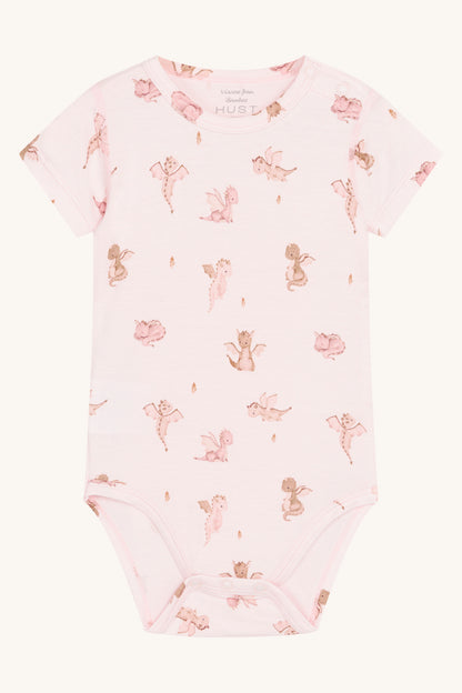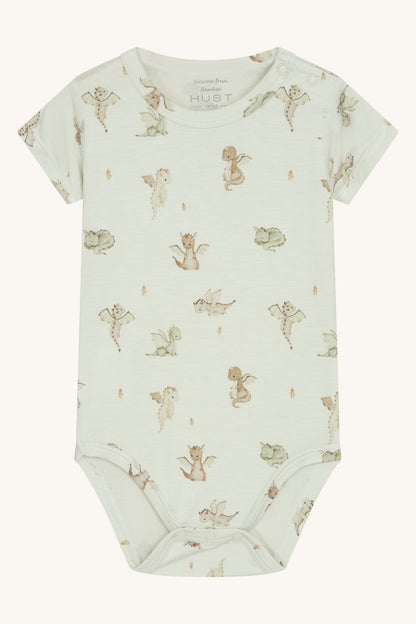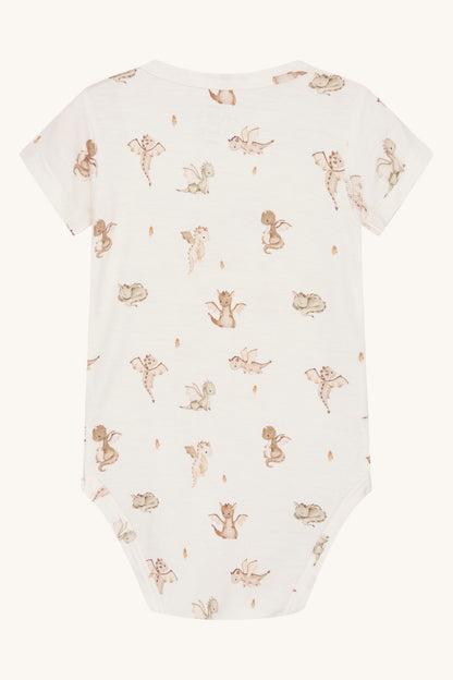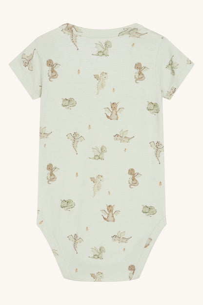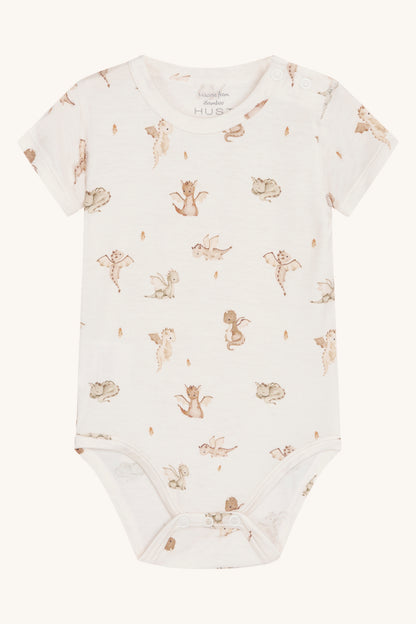 Kortærmet bodystocking i blød, strækbar viskose fra bambus med drageprint. Knapper på venstre skulder og mellem benene. Oeko-Tex 100®-certificeret.