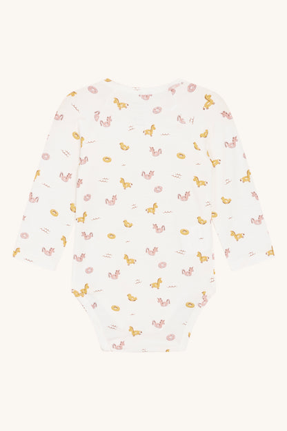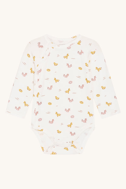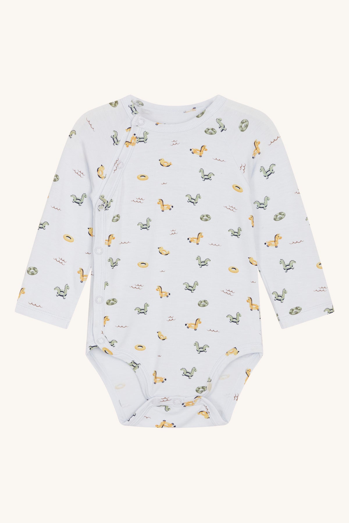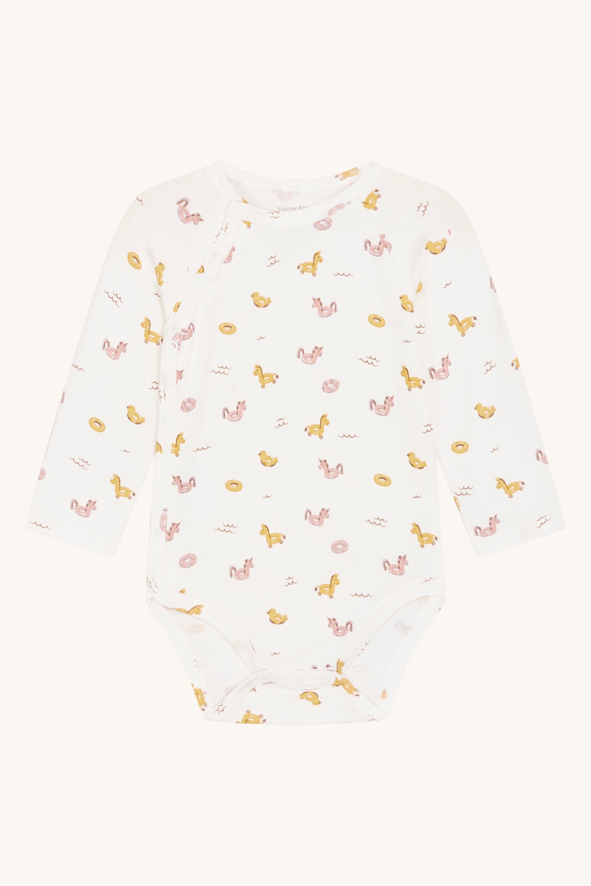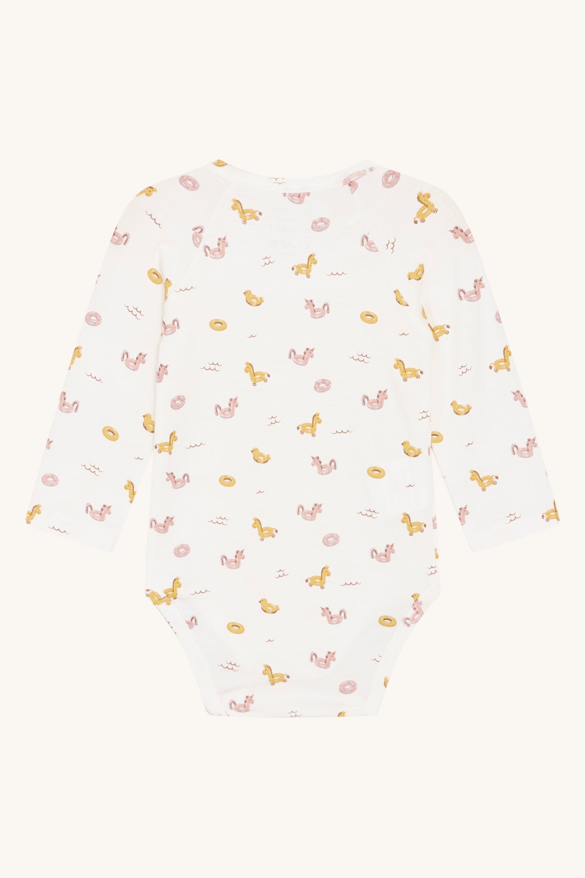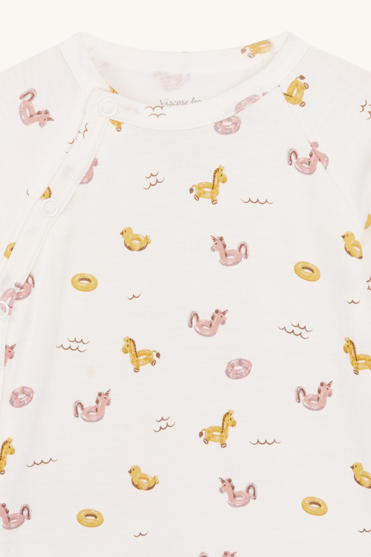Langærmet bodystocking i blød, strækbar viskose fra bambus med print af badelegetøj. Denne model har en slå-om-lukning i venstre side og knapper mellem benene. Oeko-Tex 100®-certificeret.