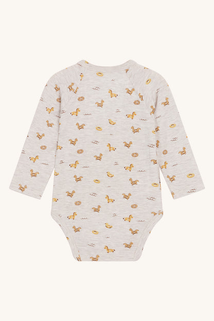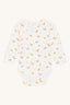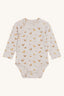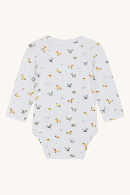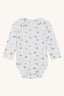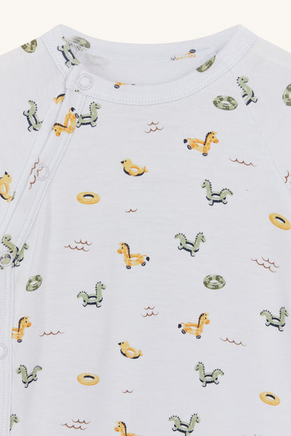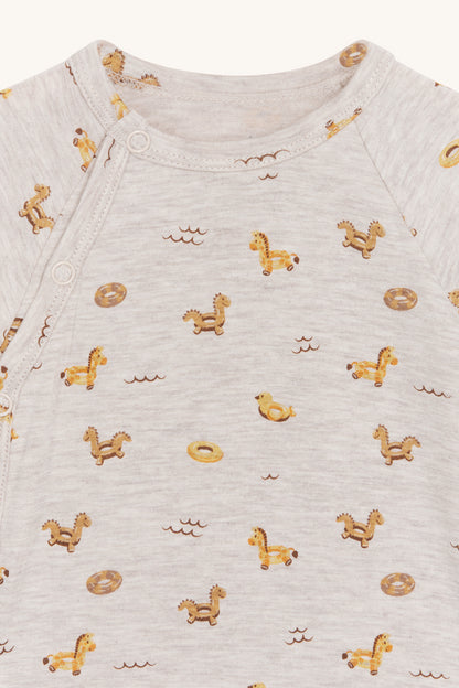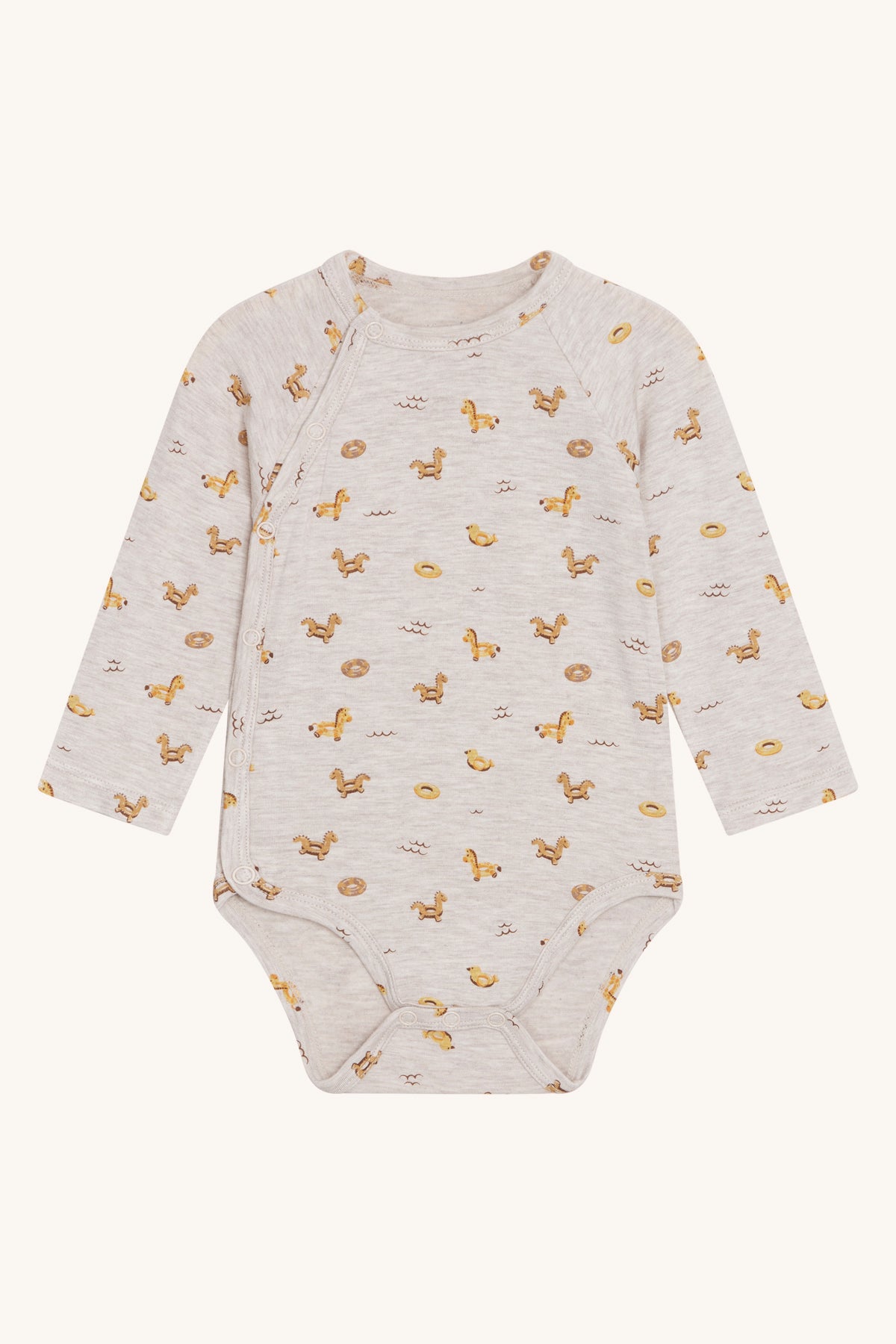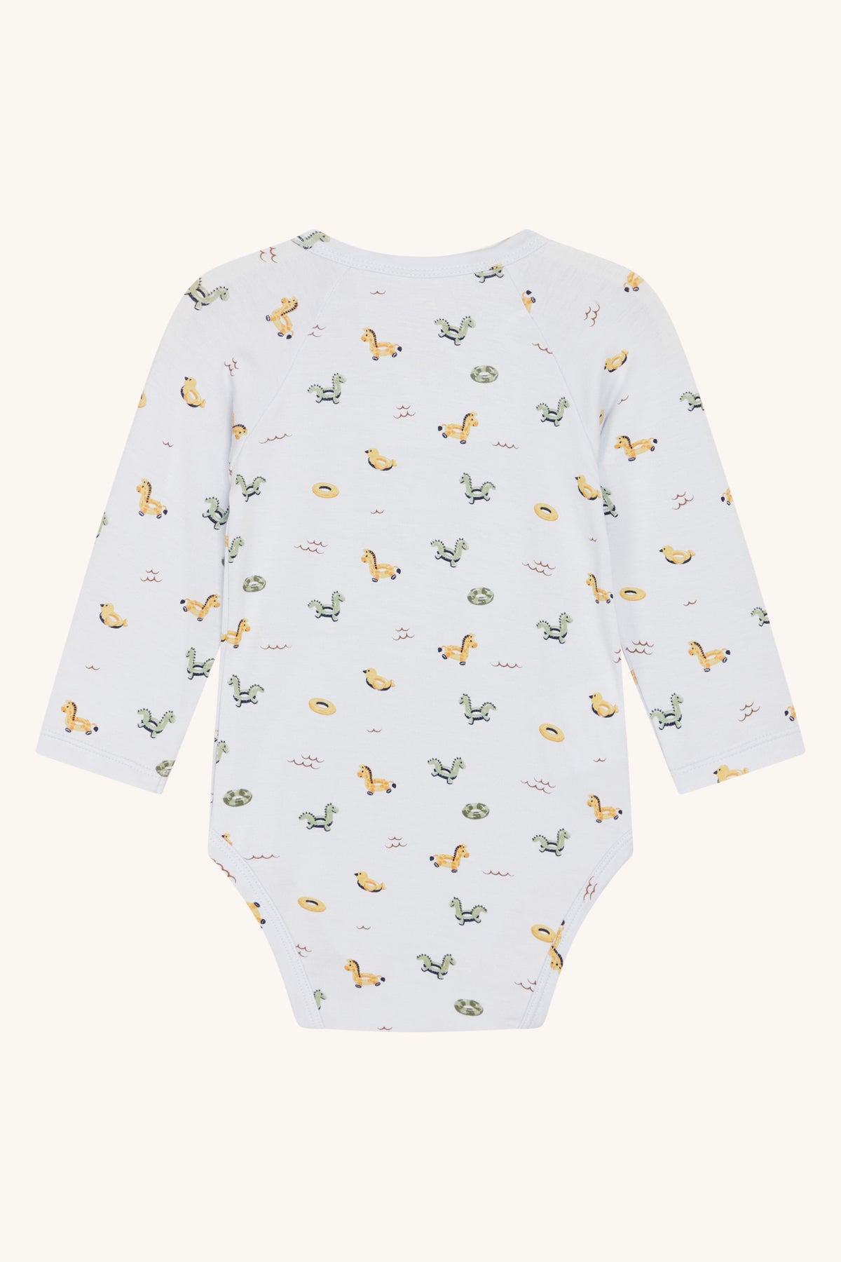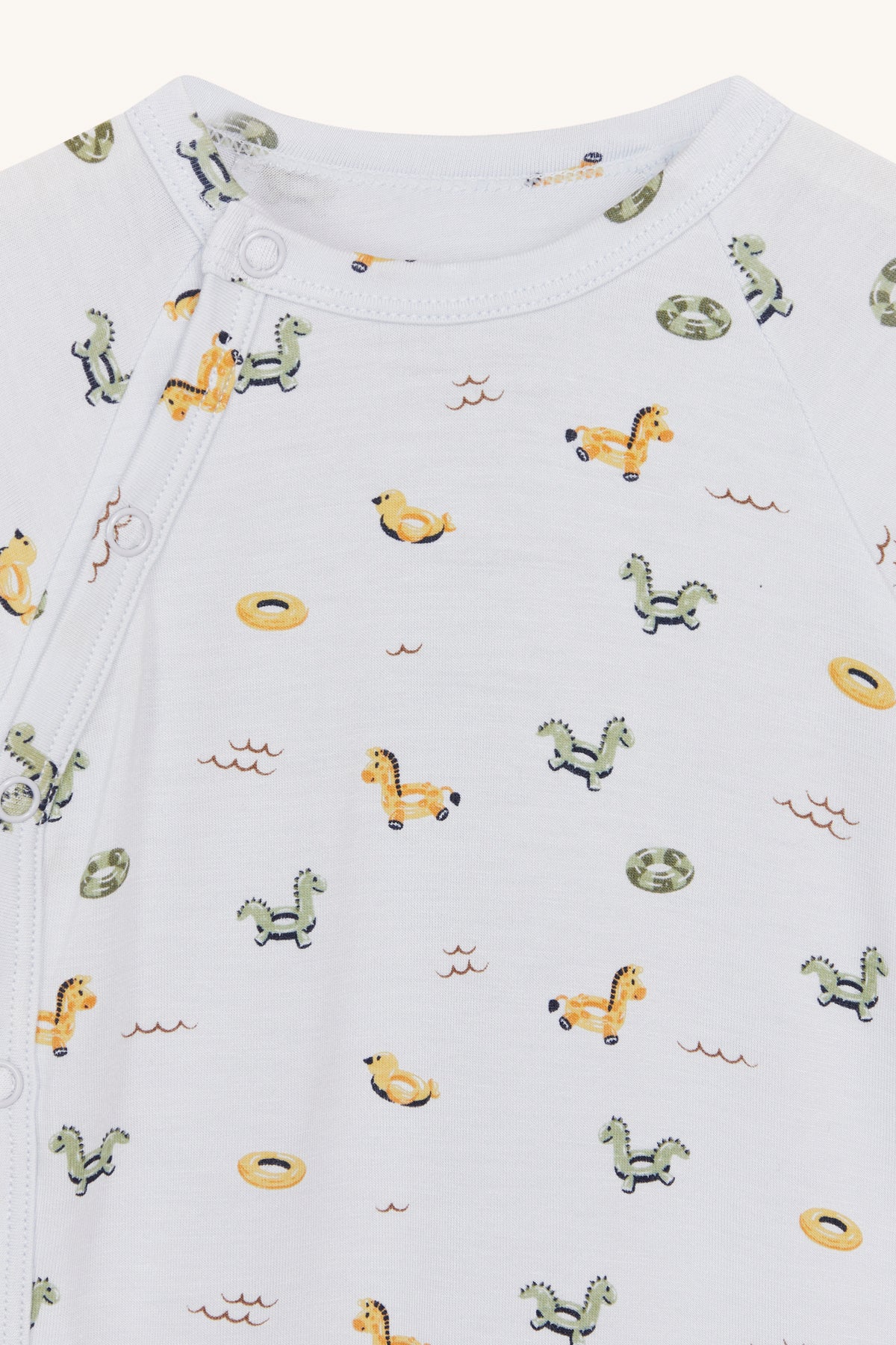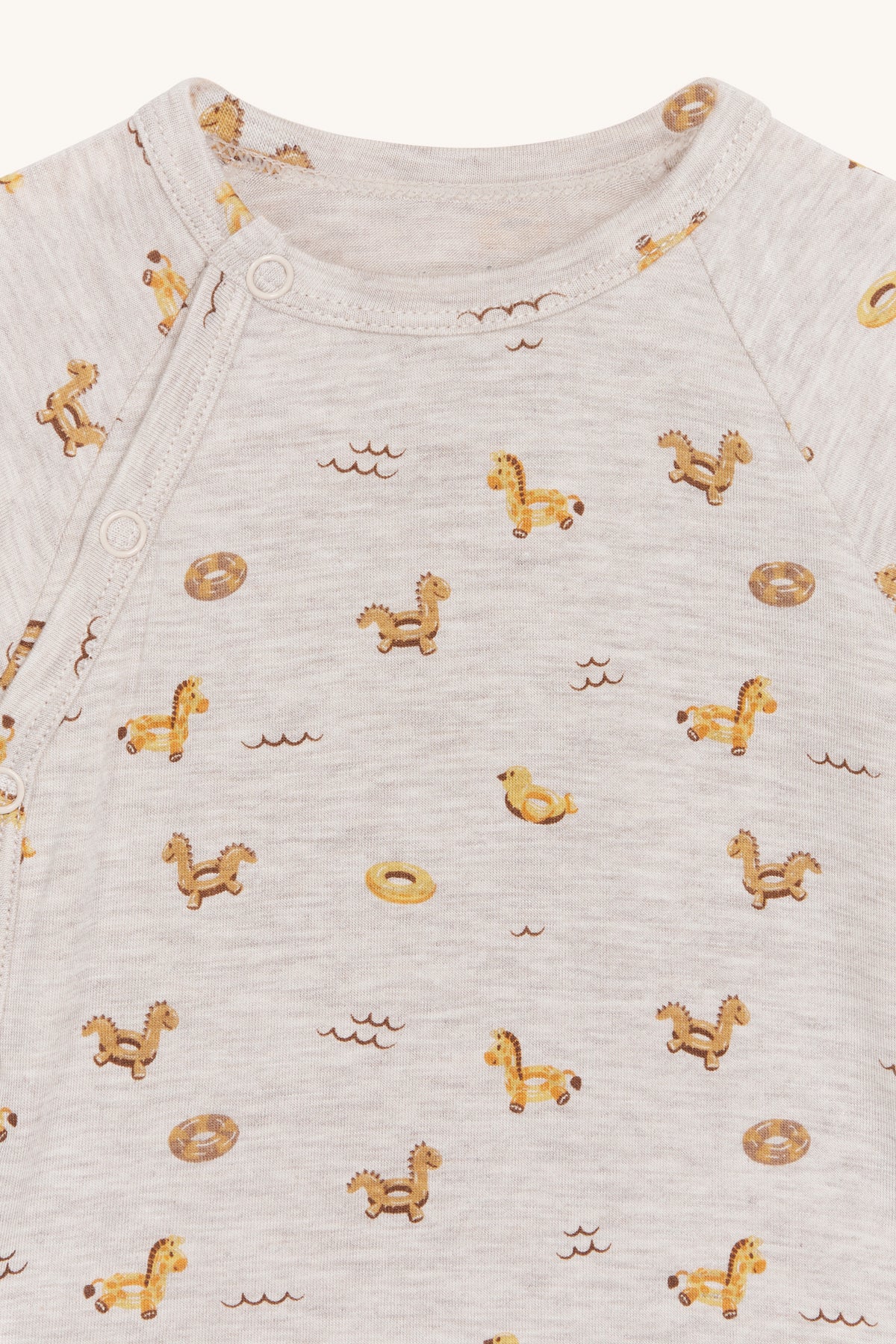 Langærmet bodystocking i blød, strækbar viskose fra bambus med print af badelegetøj. Denne model har en slå-om-lukning i venstre side og knapper mellem benene. Oeko-Tex 100®-certificeret.