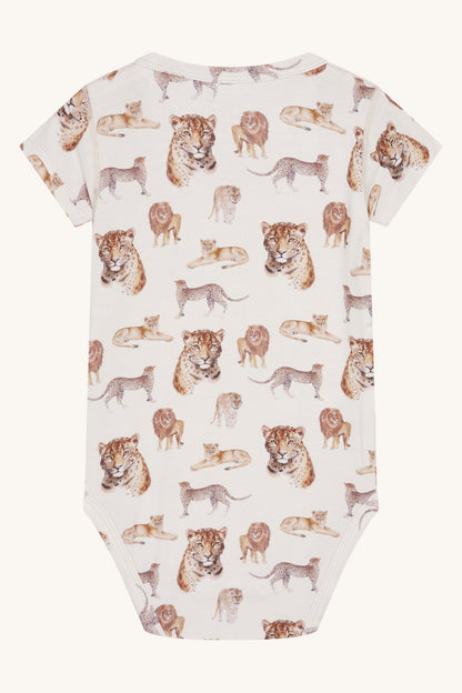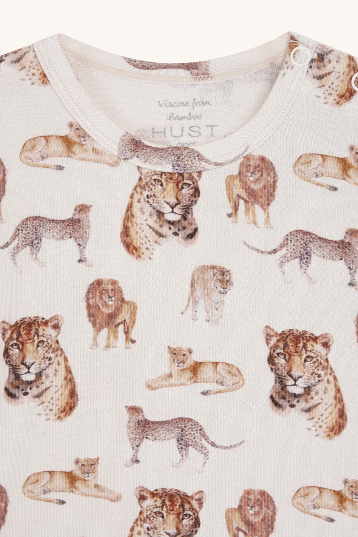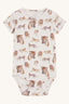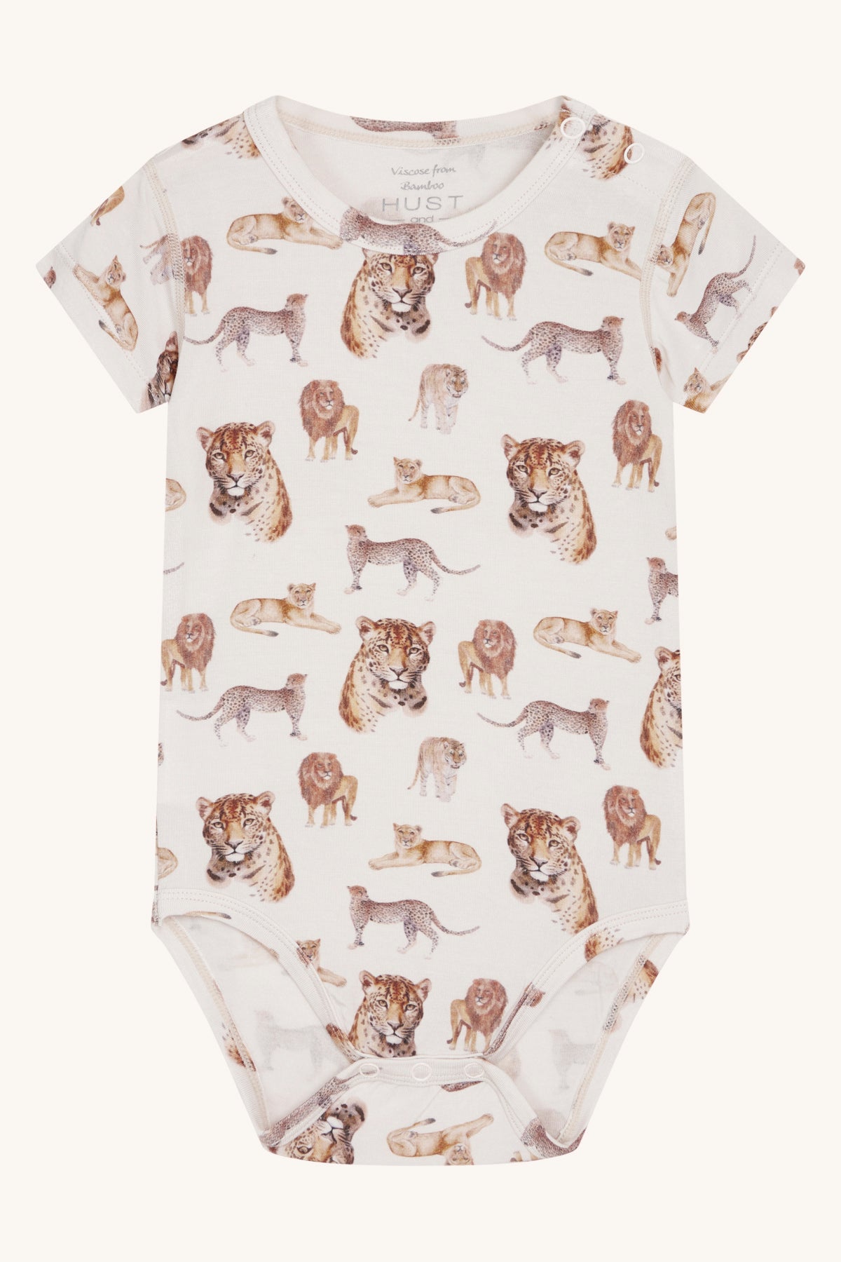 Kortærmet bodystocking i blød, strækbar viskose fra bambus med dyreprint. Knapper på venstre skulder og mellem benene. Oeko-Tex 100®-certificeret.