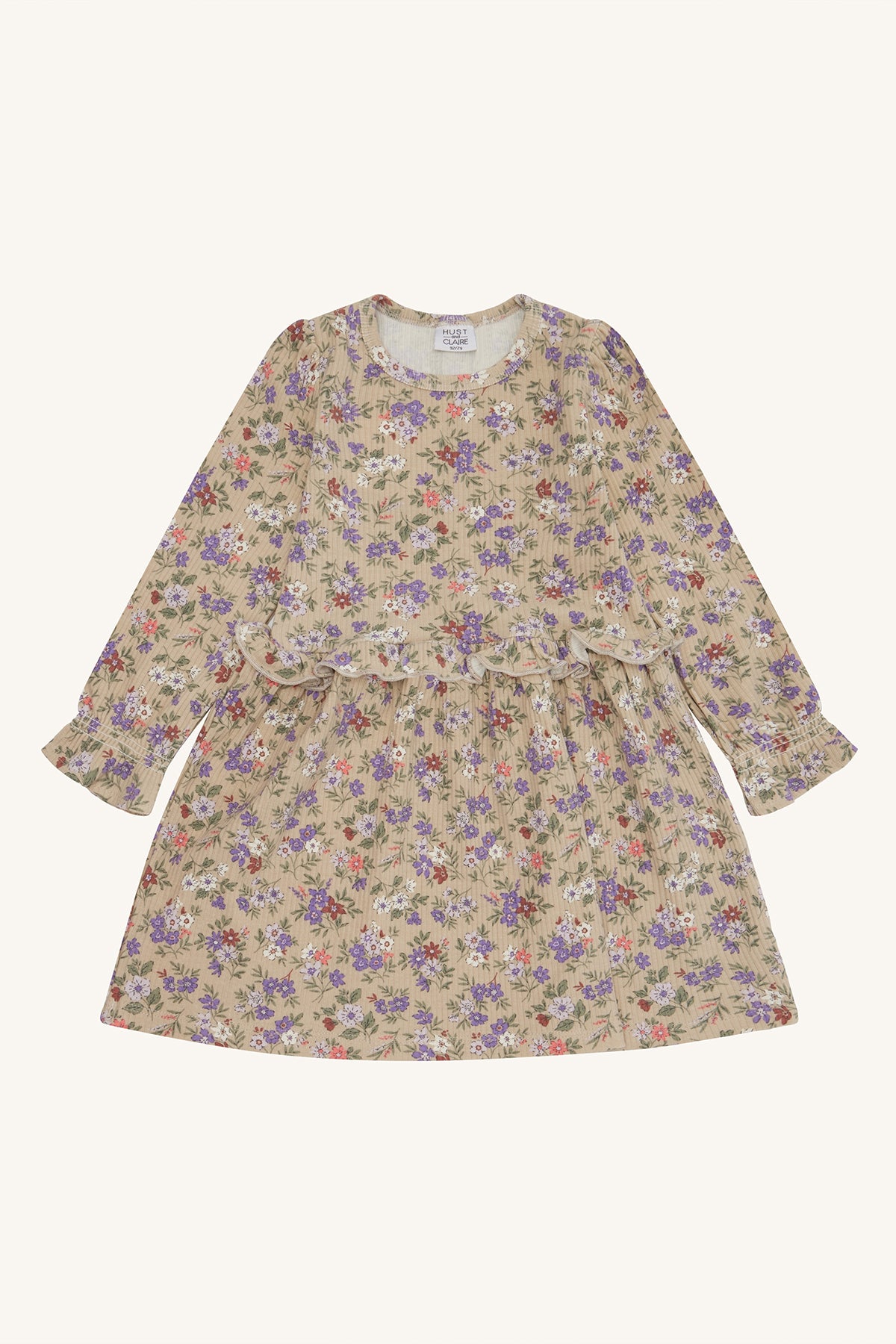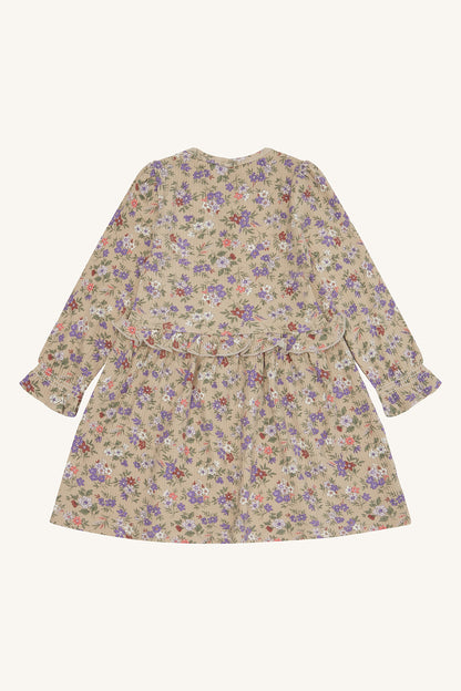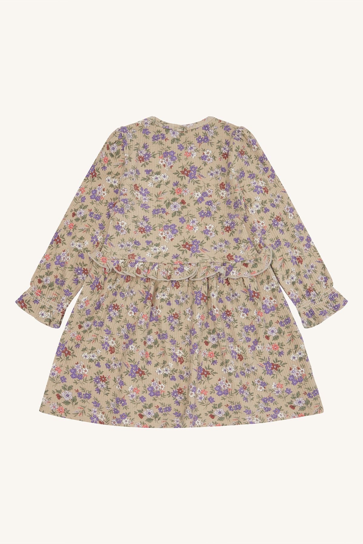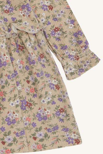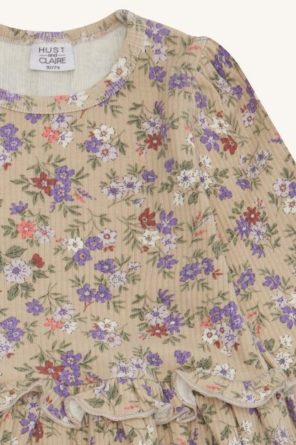 Kjole med lange ærmer i blødt ribbet materiale med blomsterprint. Kjolen har rynkede skuldre og en flæsesøm i taljen for ekstra vidde. Dette produkt er lavet af 50% økologisk bomuld.